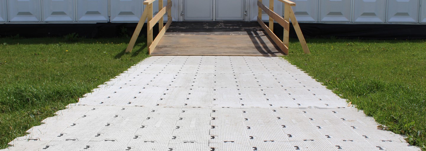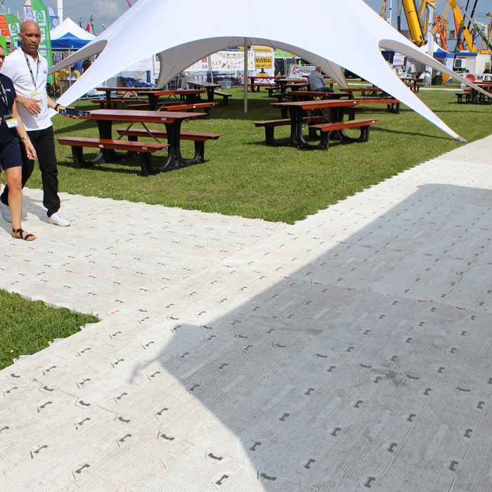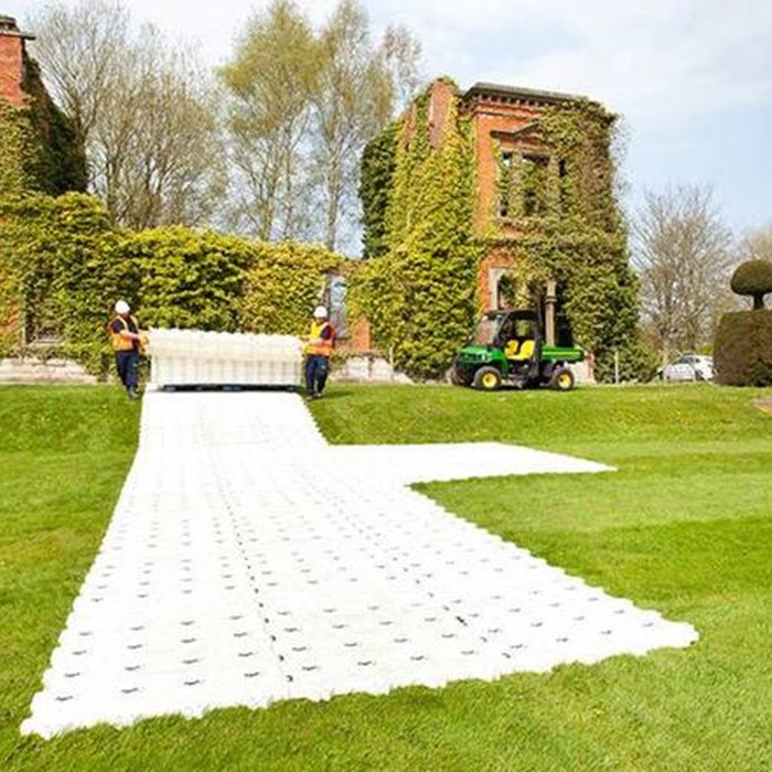 Supa-trac est un système temporaire en plastique de construction de chemins et de protection des pelouses qui s’adapte parfaitement à la circulation des piétons.